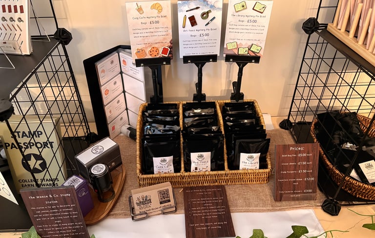 We create tiny treasures filled with fun. Blind bag pins, sticker packs, and cozy collector experiences. Every piece is lovingly created and part of a bigger story.
