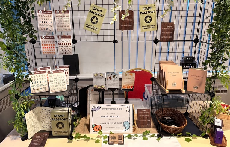 People could wander up, pick up a Stamp Passport, explore the stamp boards, flick through designs, or simply stop and chat about journals, creativity, and cozy hobbies. The table was designed intentionally with openness and ease in mind. No clutter, no overwhelm, just a friendly nook full of little trinkets and treasures.